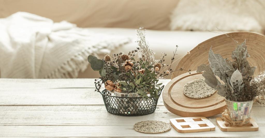 Ein Sisal- oder Seegras-Teppich sammelt den Raum, Leinenvorhänge streuen Licht, ein Couchtisch aus geölter Eiche erdet alles. Geflochtene Körbe bringen Ordnung. Teile ein Foto deines natürlich eingerichteten Sofaecks und sag uns, was sich sofort besser anfühlte.